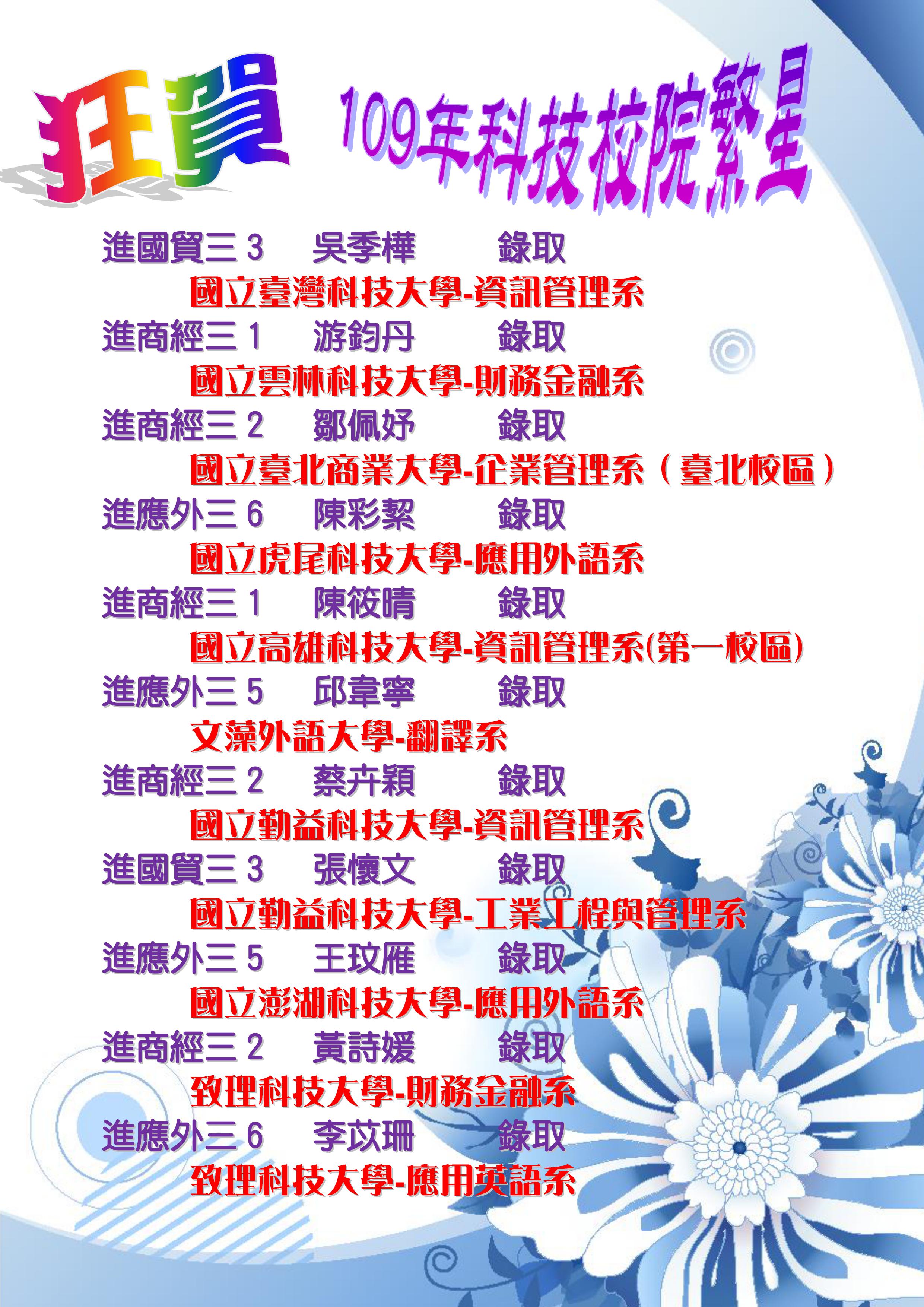 | 恭賀同學錄取理想校系! 進 國貿三3 吳季樺 錄取 國立臺灣科技大學 資訊管理系 進 商經三1 游鈞丹 錄取 國立雲林科技大學 財務金融系 進 商經三2 鄒佩妤 錄取 國立臺北商業大學 企業管理系(臺北校區) 進 應外三6 陳彩絜 錄取 國立虎尾科技大學 應用外語系 進 商經三1 陳筱晴 錄取 國立高雄科技大學 資訊管理系(第一校區) 進 應外三5 邱韋寧 錄取 文藻外語大學 翻譯系 進 商經三2 蔡卉穎 錄取 國立勤益科技大學 資訊管理系 進 國貿三3 張懷文 錄取 國立勤益科技大學 工業工程與管理系 進 應外三5 王玟雁 錄取 國立澎湖科技大學 應用外語系 進 商經三2 黃詩媛 錄取 致理科技大學 財務金融系 進 應外三6 李苡珊 錄取 致理科技大學 應用英語系 |